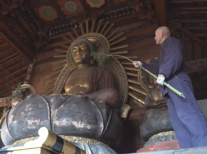 大仏殿にまします「丈六仏阿弥陀如来」は、約500年前に造立された岐阜県内最大の木造仏で、安産・子授けのご利益をいただける尊い仏さまです。普段は手の届かない御頭や肩の上などに積もった一年分のほこりを、長さ4メートルほどの竹を用いて丁寧に払い清めていきます。